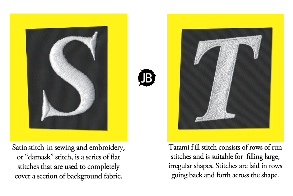 There are many different stitch patterns and techniques that exist in the realm of Machine Embroidery; Satin Stitch and Tatami Stitch are two of the most commonly used types. A Satin Stitch is made up of a series of flat stitches that completely cover the area being Embroidered, whereas the Tatami Stitch pattern consists of rows of run stitches most suitable for the filling of large and irregular shapes.